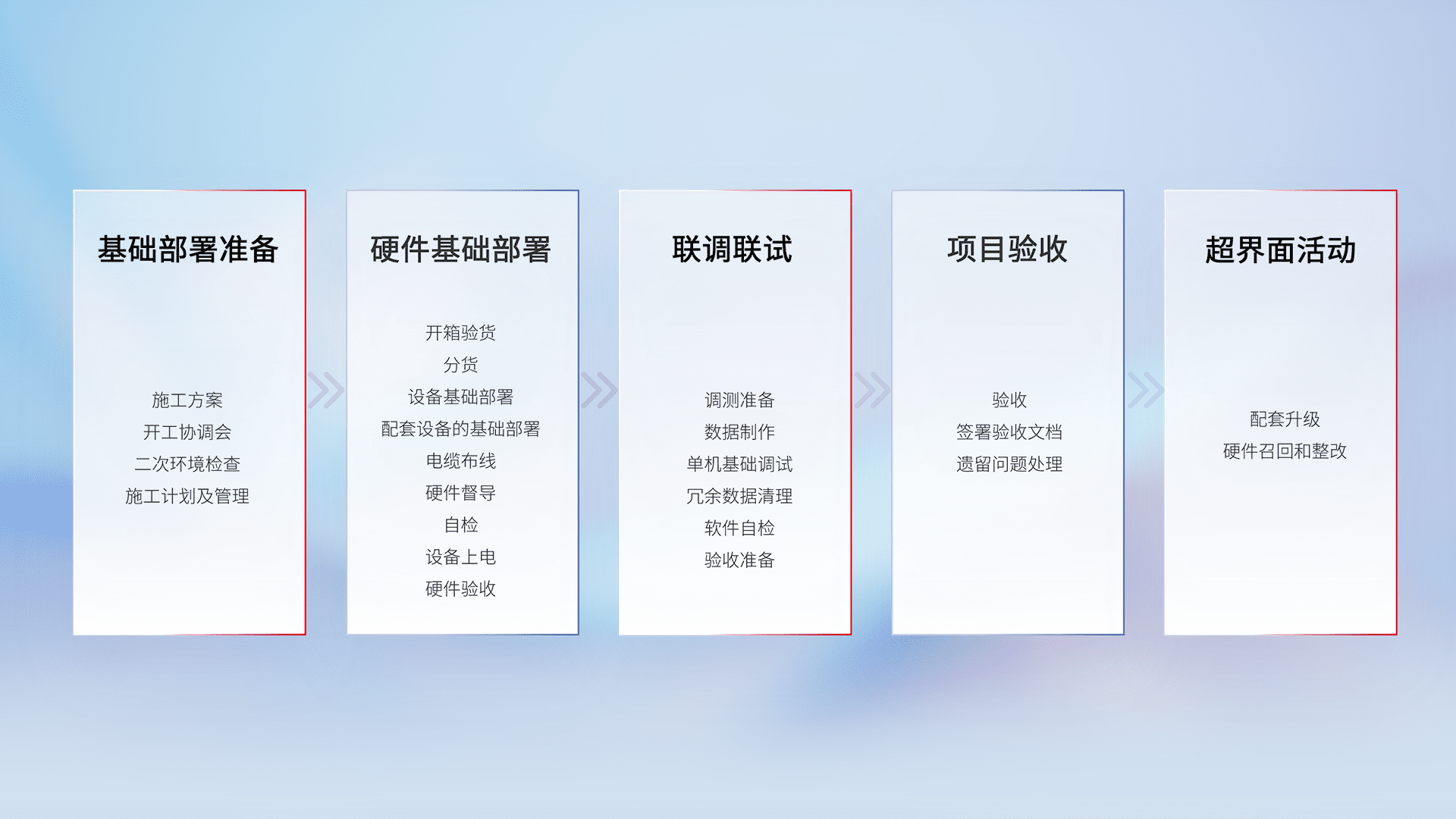 从基础部署准备、、、、硬件基础部署、、联调联试、、项目验收、、、、越界面活动的全过程可追溯,,,,保证施工质量和进度。。